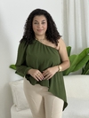 Bata assimétrica de um ombro só, manga longa bufante, lastex no punho e barra assimétrica. Leve, elegante e com caimento soltinho.
