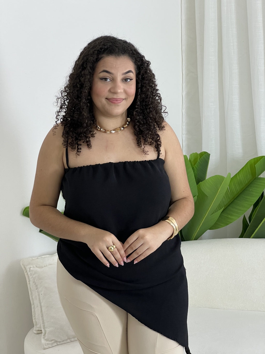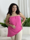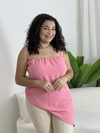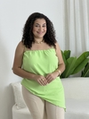 Bata feminina em tecido leve, com alças finas, decote reto e modelagem assimétrica na barra. Possui fenda lateral, proporcionando um toque moderno e elegante.